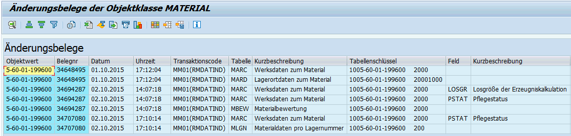 Hilfreich kann der Report beispielsweise sein, wenn die getätigten Änderungen am Materialstamm für einen gewissen Datumsbereich ausgelesen werden sollen. Auch die Felder "Neuer Wert" und "Alter Wert" sind in der Ergebnisliste aufgeführt.
